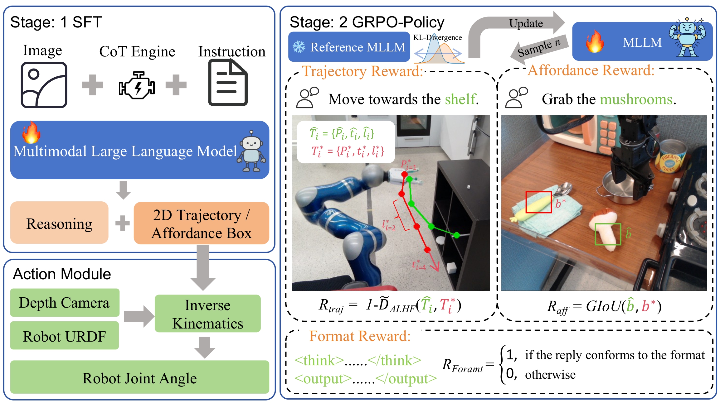 Overall architecture of VLA-R1. The system operates in two stages. Stage I applies supervised fine-tuning (SFT) augmented with Chain-of-Thought (CoT) supervision to endow the multimodal model with foundational reasoning, enabling it to generate trajectories or affordance regions conditioned on images and instructions; a downstream control stack then converts these outputs into joint-level robot commands. Stage II introduces reinforcement learning with verifiable rewards (GRPO) to further refine both reasoning quality and action execution, yielding more robust cross-task generalization and resilience in complex scenarios.